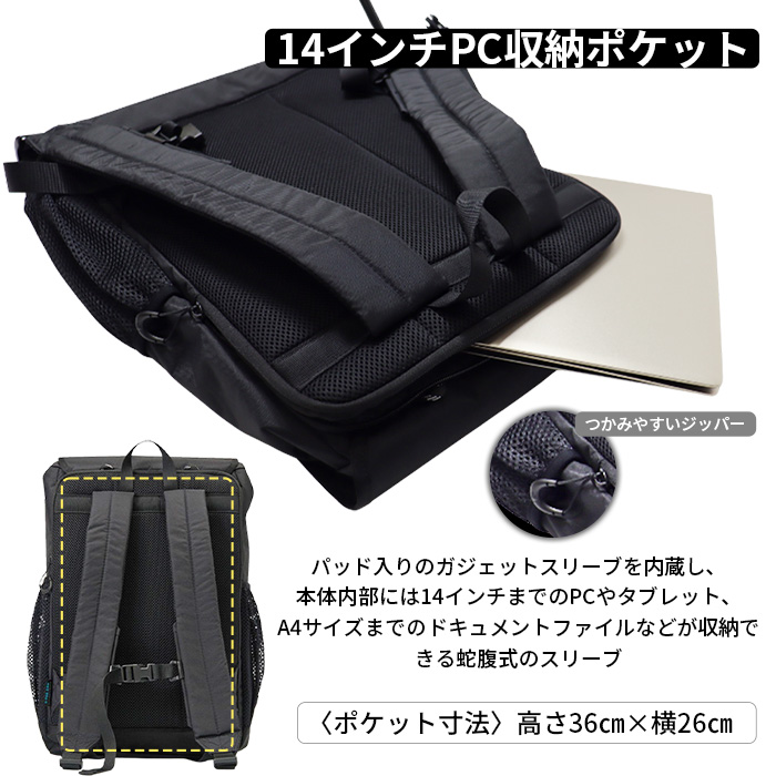 ・背面には14インチPC収納できる柔らか素材のスリーブポケット