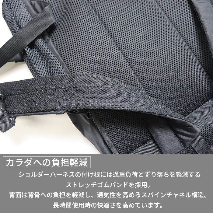 ▽快適に背負いやすいように背骨への負担軽減し通気性高めるスパインチャネル構造、