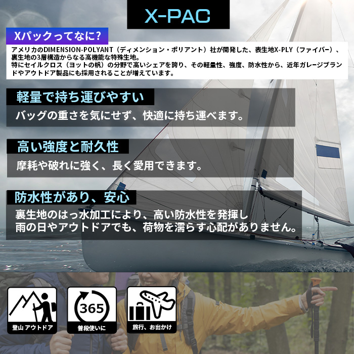 軽量かつ頑丈なX-Pacナイロン製 でアウトドアをはじめ、物の多い社会人まで幅広いニーズに対応します。