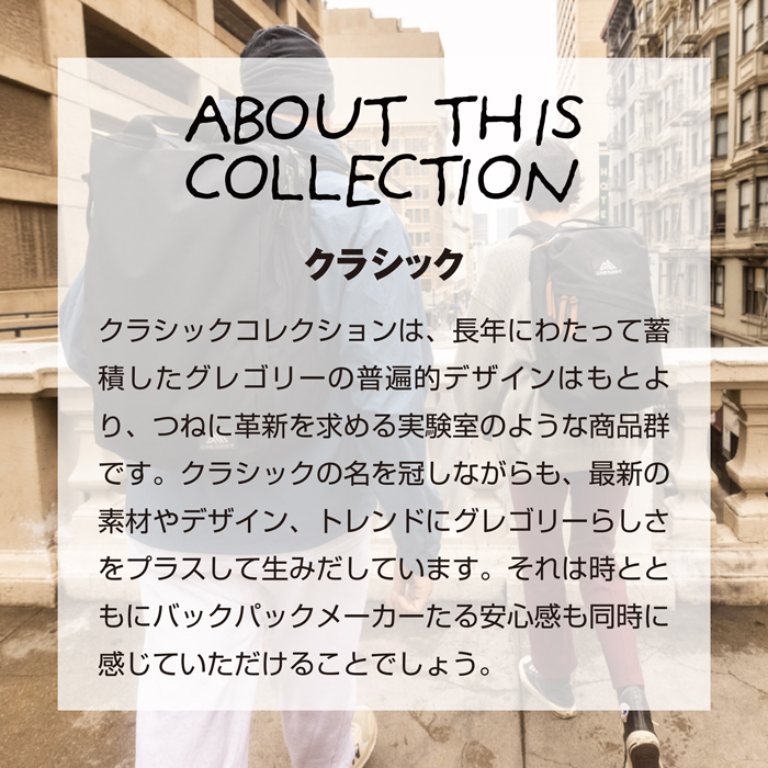 クラシックコレクションは、長年にわたって蓄積したグレゴリーの普遍的デザインはもとより、
