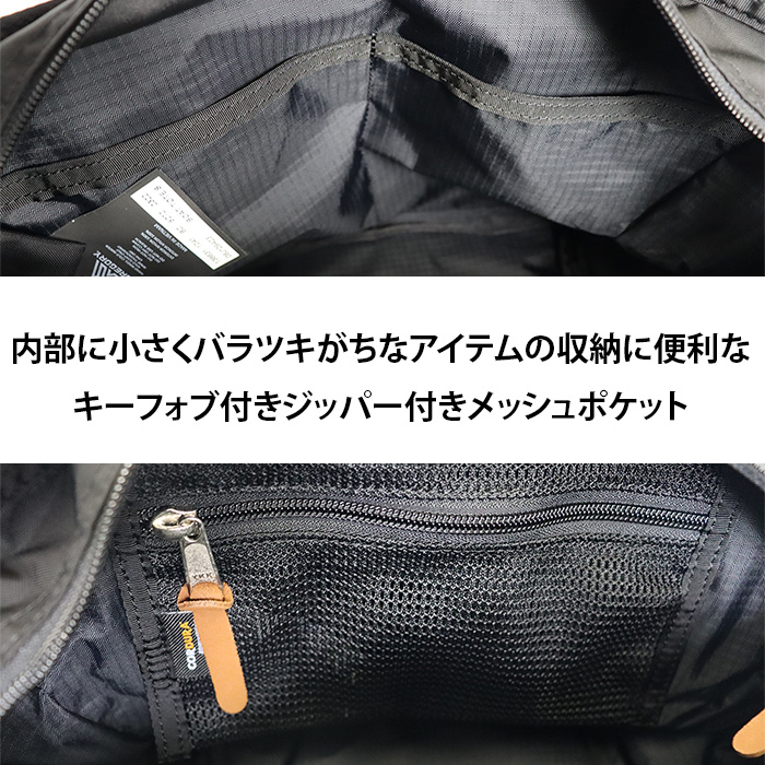 ▽ 内部に小さくバラツキがちなアイテムの収納に便利なキーフォブ付きジッパー付きメッシュポケット