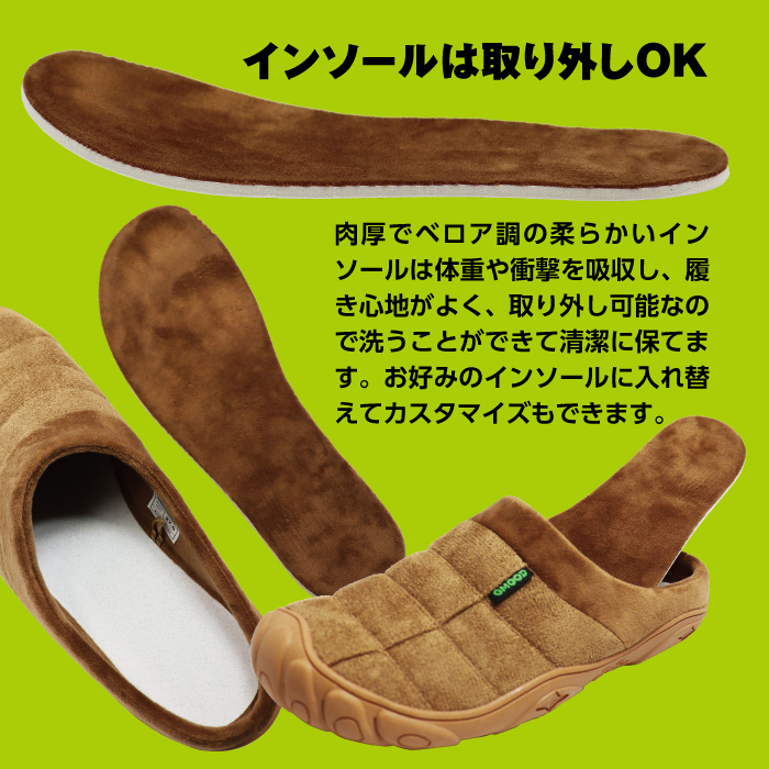 肉厚でベロア調の柔らかいインソールは体重や衝撃を吸収し、