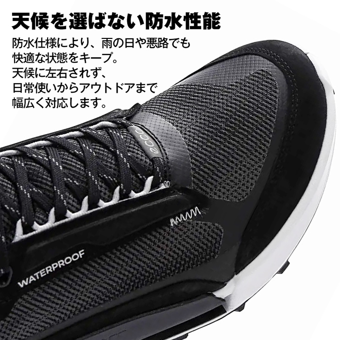 ECCO独自の防水構造を採用し、雨の日や悪路でも快適な状態をキープ。履き心地を損なわない設計で、天候を気にせず着用できます。