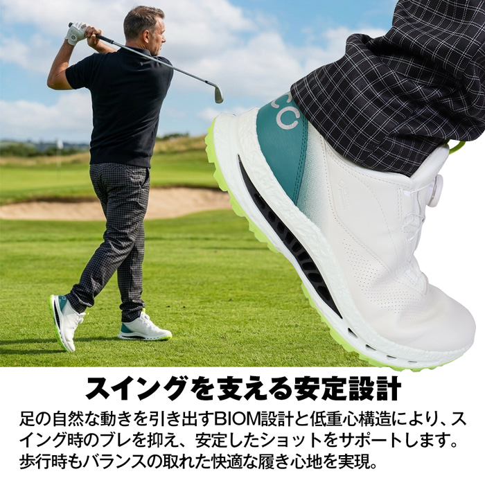 足の自然な動きを引き出すBIOM設計により、安定したスイングと快適な歩行を実現します。