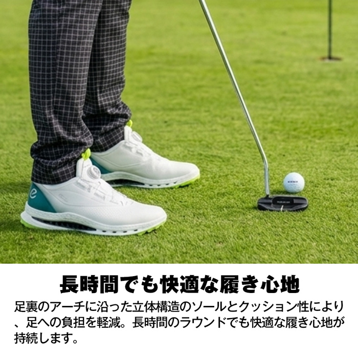 軽量設計とクッション性に優れたソールが足への負担を軽減し、ラウンド中の疲労を軽減。