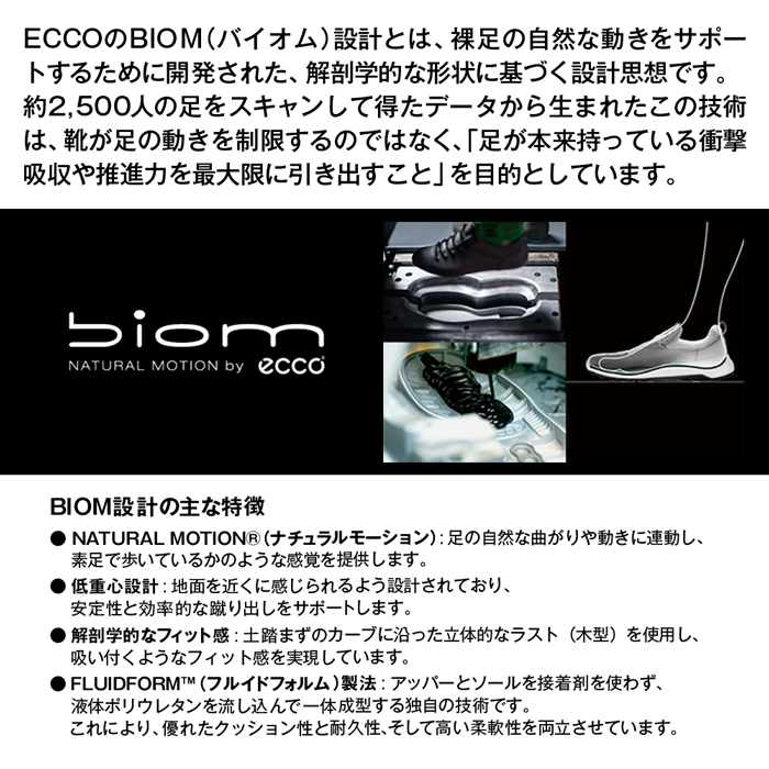 ECCO独自のFLUIDFORM(フルイドフォルム)製法によるソールが、足にフィットするクッション性と耐久性を両立し、