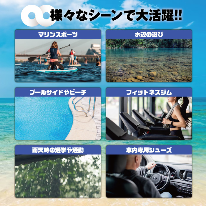 洗車や水を使う掃除、フィットネスやトレーニングのジムシューズ、軽いので持ち運び簡単なモバイルシューズ、