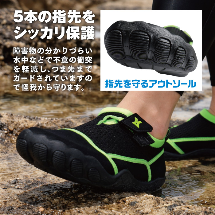 水中や岩場での不意な衝撃から足を守ります。